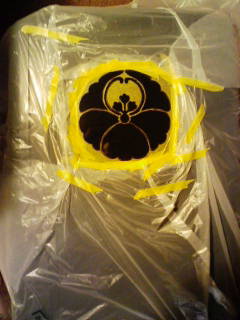 まずは家紋の元原稿ですね。これは家紋検索サイトから似たやつ探してきて、フォトショップで簡単に加工して、引き延ばした上でペンでなぞって修正して使用しました。これはペンで修正してる途中の写真。この原稿に、マスキングシートをかぶせて、ライトボックスで下から照らしてなぞります。