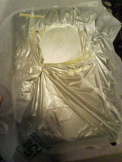 こんな感じで、まわりをカバーしてスプレー飛ばないようにします。ここでマスキングテープとゴミ袋大活躍。ゴミ袋はハサミで裂いて使いました。